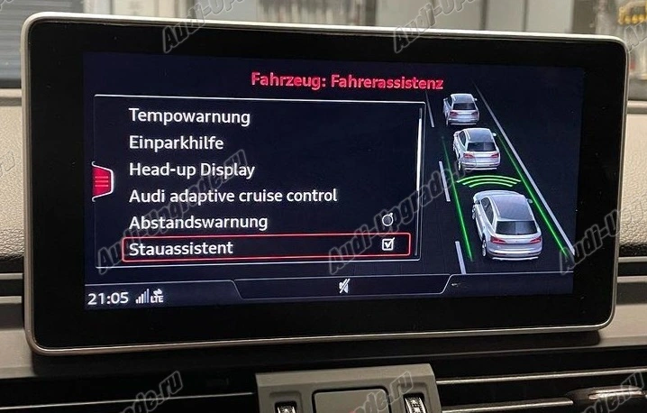 -Адаптивный круиз-контроль. Адаптивный круиз-контроль поддерживает расстояние до впереди идущего автомобиля с помощью автоматического торможения и разгона (в диапазоне 0–250 км/ч). Настройка характеристик ускорения и регулирования производиться при помощи системы Audi drive select. Функция Stop and Go самостоятельно осуществляет торможение вплоть до полной остановки и автоматическое возобновление движения по желанию водителя. Система Audi pre sense front анализирует дорожную ситуацию на возможность лобового столкновения и принимает меры по снижению возможных последствий ДТП.